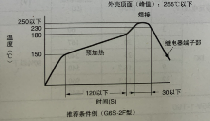 焊接推荐条件虽然显示出了印刷电路板面的温度曲线,但是各继电器的条件可能会有所不同,因此请在对各规格加以确认的基础上进行使用,在焊接之后,请勿立即浸渍到清洗液等冷却液中,会损伤继电器的密封性,如下图所示: