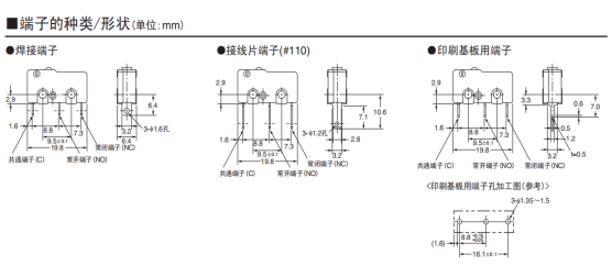 2、微动开关外形尺寸和端子的种类也是很重要: