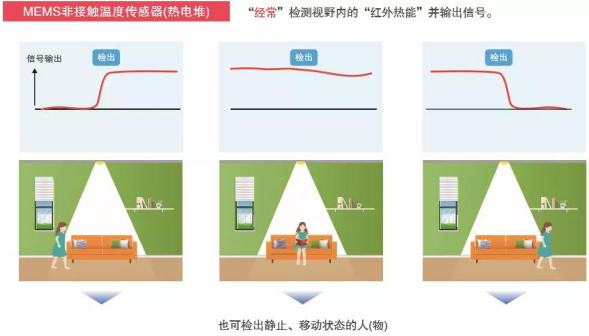 MEMS非接触式温度传感器D6T系列通过检测人和周边环境之间的温度差和温度变化,可检测到人体。其可根据细微的温度差和温度变化进行检测,适用于家电节能、安防设备等各种用途,广泛应用于HEMS、BEMS领域。