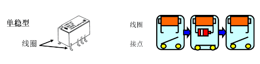 单稳型:在线圈得电时,接点执行动作,而线圈失电的时候,接点就会复位。如下图所示: