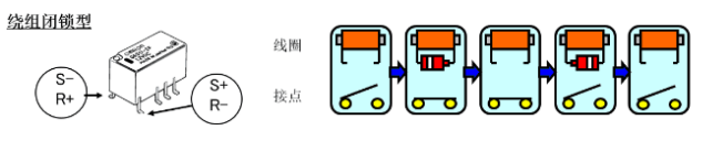 2绕组线圈闭锁型继电器是给置位线圈通电,然后接点执行动作,当线圈断电后接点同样可保持前一状态,仅仅只能通过给复位线圈通电时接点才能复位。如下如所示: