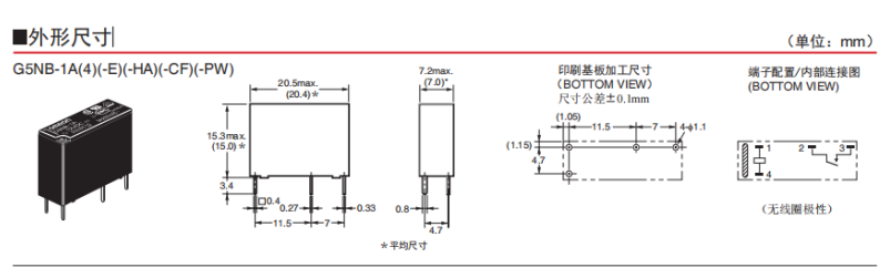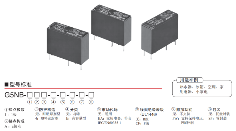 G5NB功率继电器具有耐冲击电压10KV的1极3A/5A开闭的小型继电器,采用了高功率电磁回路,实现了高灵敏(200mW),标准品还取得了UL、CSA、VDE认证,在使用上符合EN61010强化绝缘标准,还支持保持电压、PWM控制,有助于节能(G5NB-( )-PW型)