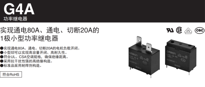 欧姆龙G4A系列继电器,实现通电80A、通电、切断20A的电机负载开闭,1极小型功率继电器,却可以实现高容量开闭、高耐久性。符合RoHS、EN/IEC(VDE认证)、UL、CSA空调规格,确保绝缘距离,采用抗干扰性强的高绝缘构造。标准品采用耐助焊剂构造。