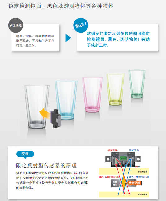 欧姆龙在光学传感技术方面的成功,为其聚光反射式传感器B5W产品开发铺平了道路。该系列传感器为多领域应用而设计,它们能够探测到包括反光和透明材质在内的所有不同类型的物体。