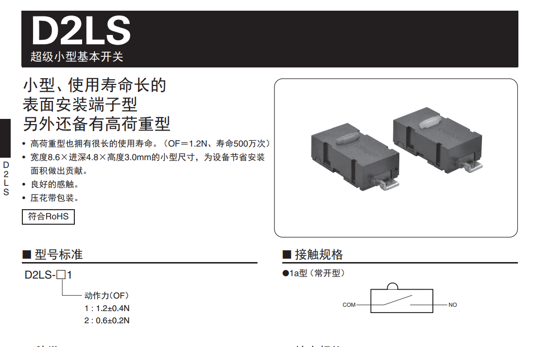 在智能插座中会有用到欧姆龙的微动开关和继电器,今天我们来说说开关插座中最常用的欧姆龙产品系列,D2LS和SS系列,如下图