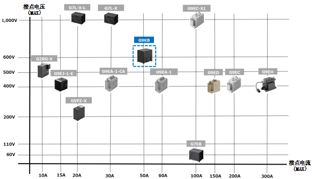 下面是欧姆龙直流高容量继电器产品阵容图(蓝框为本次发售的G9KB)