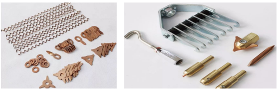 工作原理:利用低电压、高强度的电流流过两块钢板(或钢板与介子)时产生的高电阻热熔化接触部分的金属,用焊枪电极挤压力把它们熔合焊接在一起,再用拉拔工具如惯性锤,实现修复板件缺陷的目的。附图工具:图1介子垫圈 图2:碳棒 铜头