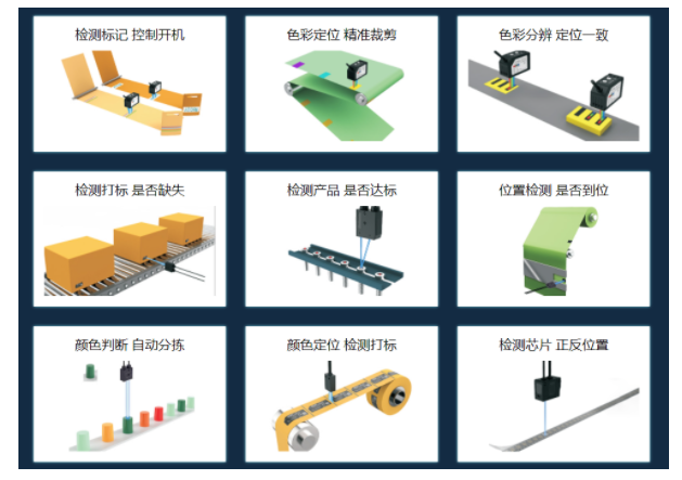 颜色传感器主要用于检测目标物体表面颜色,主要在工业、医疗和安防系统中有着广泛的应用。常见用途有混料检测、有无检测、污渍检测等等。采用传统光电传感器通过反射光量之差进行检测时,可能会检测背景、受背景影响导致无法对检测物体执行稳定检测的现象。如果采用通过颜色传感器输出各检测物体颜色信号的方式,有时可确认检测物体的有无。