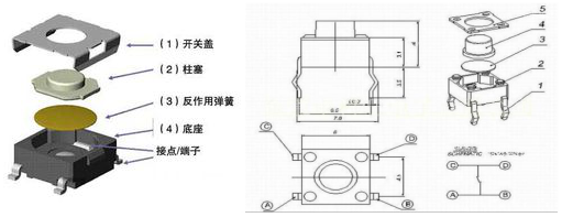 轻触开关由:盖板,按钮,弹片,基座,引脚五大部分组成