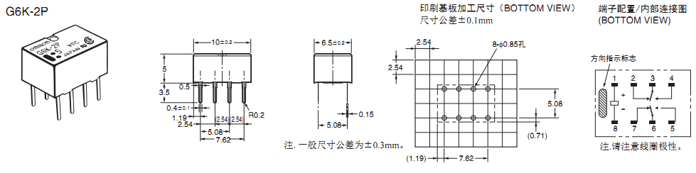 高5.2mm×宽6.5mm×长10mm的超小型,对应高密度封装(G6K(U)-2F(-Y)型)。
