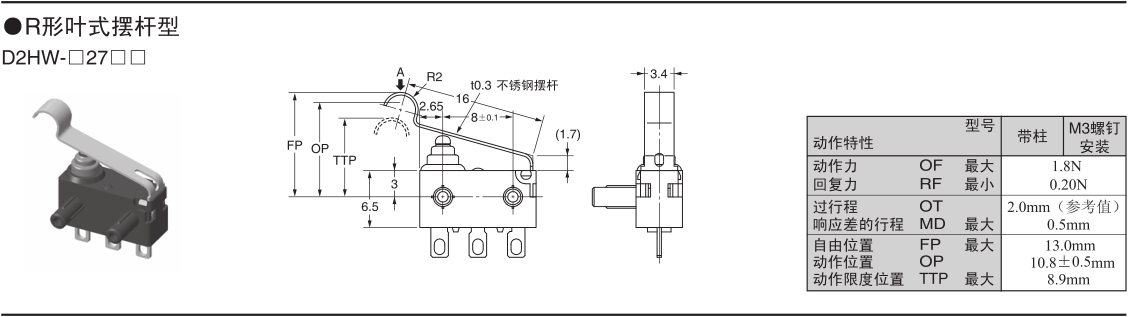 欧姆龙微动开关,D2HW-C271H,欧姆龙微动开关D2HW