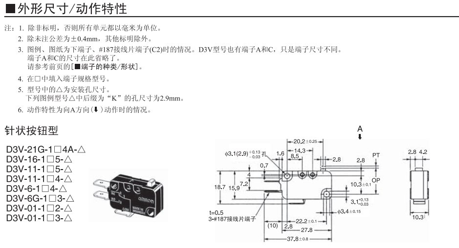 欧姆龙微动开关,D3V-16-1A5,欧姆龙微动开关D3V