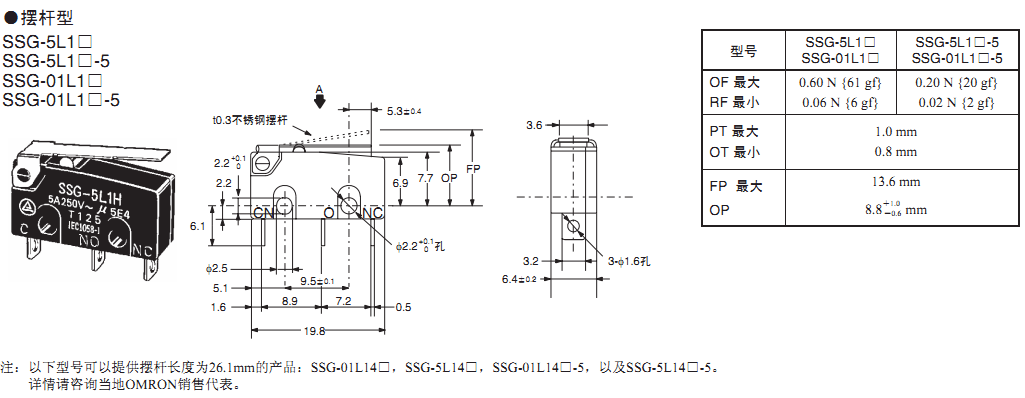 欧姆龙微动开关,SS-5L1P,欧姆龙微动开关SS