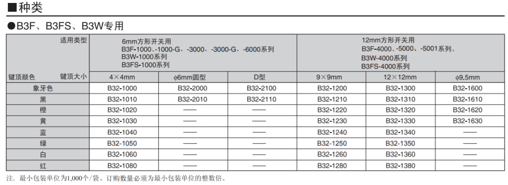 B3F-4050按键帽子B3F、B3FS、B3W的凸型柱塞类型专用键顶