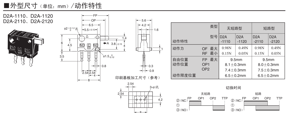 欧姆龙超小型(高6×宽8×深4.2mm)、轻量(约0.3g)、3mm的长行程。