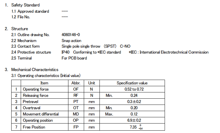 D2FC-F-7N (20M) 克力为:60+/-15G,寿命为2000万次;