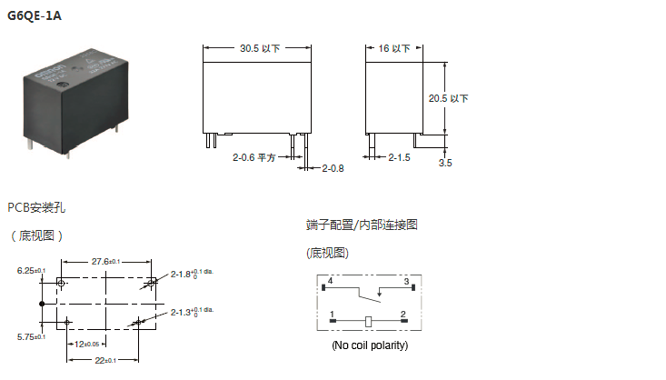 | 印刷基板用端子 | 标准型 | SPST-NO (1a) | 耐助焊剂 | G6QE-1A |